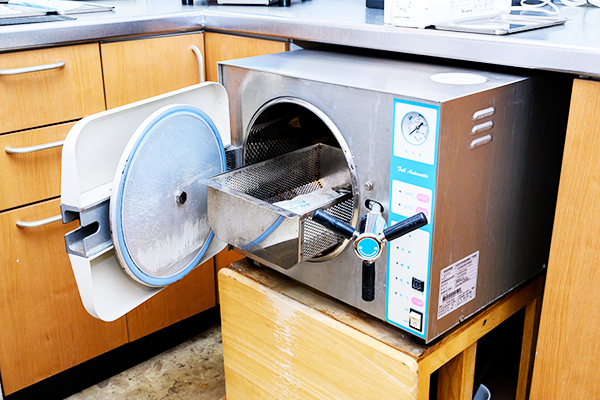 器具を完全に無菌状態にするための機械です。高温(約121〜134℃)、高圧の飽和蒸気を利用して、細菌・ウイルス・芽胞などの微生物を確実に死滅させます。これは単なる消毒・殺菌ではなく 「滅菌」 と呼ばれる最も強力な方法です。