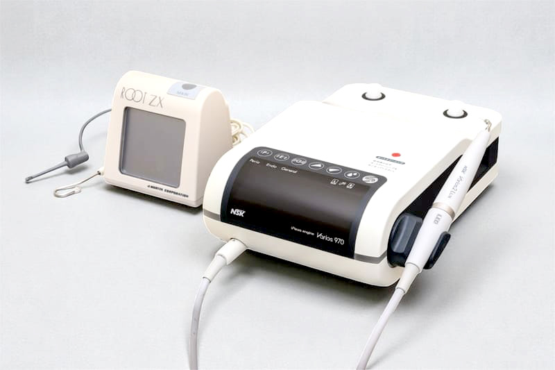 根管治療(歯の根の治療)の際に根管長測定器と超音波洗浄機を使用しています。歯の根の長さを0.5mm単位で正確に測定し、超音波の振動で手作業では届きにくい部分まで洗浄できるため、より精密で確実な根管治療が可能になります。