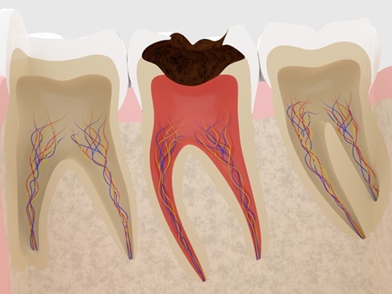 神経を取った歯は、栄養が届かなくなるため弱くなり、色も変わってきます。また、痛みを感じなくなるため、再び虫歯になっても気づきにくいというデメリットがあります。当院では可能な限り神経を残す治療を行っています。