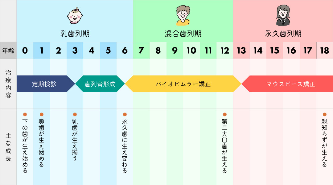 実際の矯正治療は、3歳から歯列育形成、6歳からバイオビムラー矯正が可能です。早く始めるほど、将来的に抜歯せずに済む可能性が高まります。
